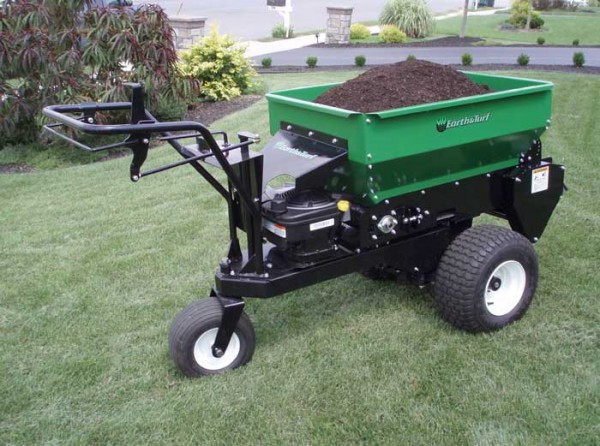 Earth & Turf Products’ 60SP self-propelled topdresser is economical and maneuverable. It is ideal for spreading dry or wet compost and sand, plus a variety of other materials. It features easy loading into its 6.7 cu. ft. hopper. The maximum load weight is 650 lbs. (296 kg). Optional loading chutes will increase capacity for lighter materials such as compost. A wide-spread beater produces an even spread pattern up to 42″ wide. The 60SP is powered by a 190cc Briggs & Stratton, 875 series, 6.5 HP engine. The drive is by CV belt, forward and reverse.