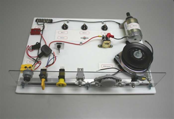The Basic Electrical Training Board is modeled after a typical riding lawn mower electrical system.