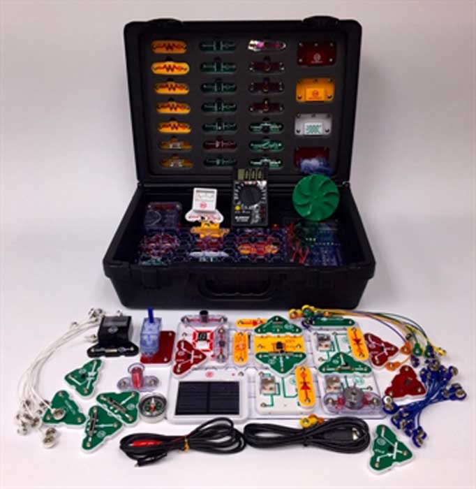 The system constructs more than 600+ live working circuits, with re-usable electronic components. The system stores all components in a compact hard case, with labeled compartments.