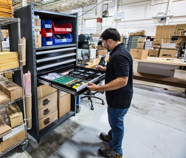 Drawers can be labeled with hinged handle covers and Lista Script software to ensure optimal organization and improved product retrieval time.